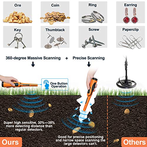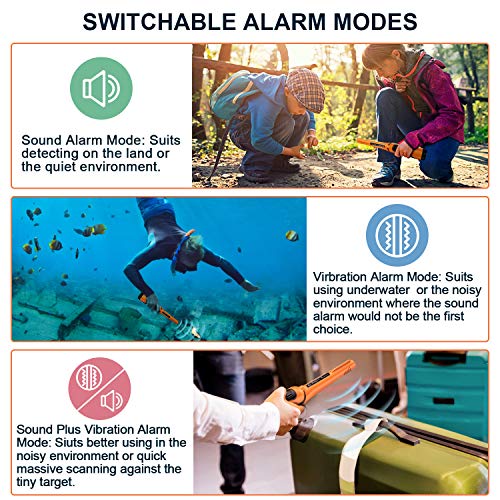 360 graden nauwkeurig en uitstekende gevoeligheid. De metaaldetector pinpointer voert nauwkeurige detectiewerkzaamheden. Het alarm stijgt wanneer het metaal nadert. 3 verschillende alarmmodi: audioalarm, trilalarm (geruis), trillingen plus audioalarm. LED-lampen zijn nuttig in het donker. De gevoeligheid is met ongeveer 35% verhoogd ten opzichte van de normale metaaldetector, wat overeenkomt met 35% hogere kans op schatten te vinden.